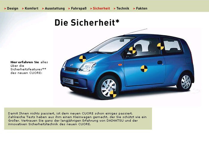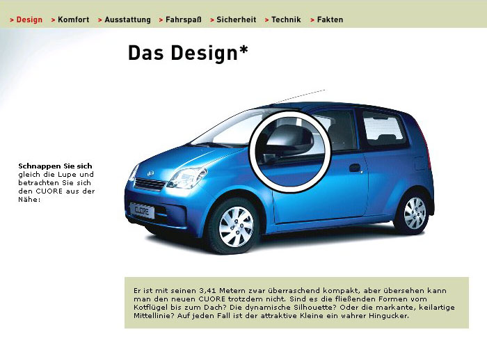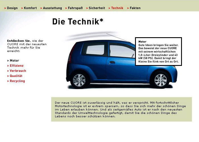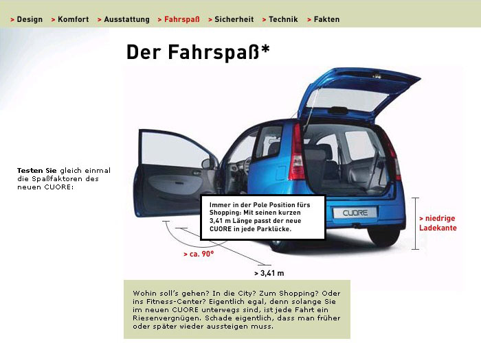Auf 3,41 Metern vereint der Daihatsu Cuore alles, was man zum glücklichen Autofahren braucht. Das ist so viel, dass es für eine ganze Website reicht.